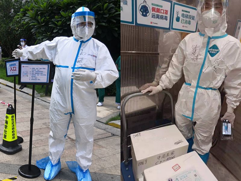 6月1日,高瑞晨、邹世顺和队员们前往高风险白鹤洞社区首次“参战”,现场第一项任务是协助社区工作人员为居民派送物资。他们一接到任务就马不停蹄地忙碌起来。